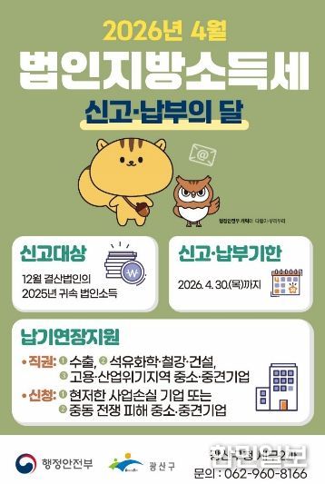 한민일보 서울포커스 임경복 기자 | 광주 광산구가 지역 내 사업장을 둔 법인을 대상으로 2025년 귀속 법인지방소득세 확정신고 기간을 30일까지 운영한다.