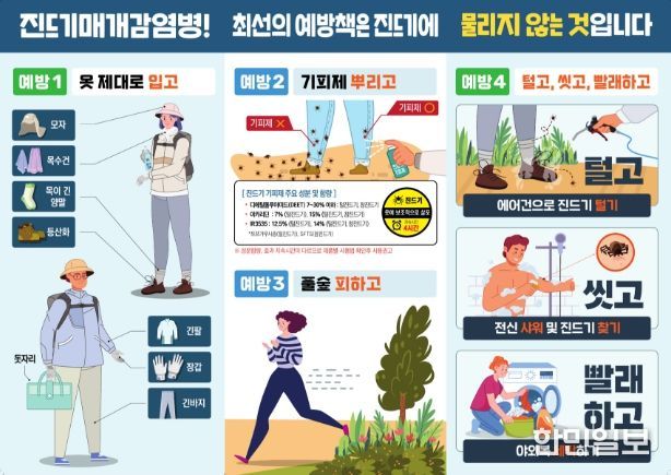 예방수칙의 핵심은 △야외 활동 전 긴 옷과 장화 등을 착용해 피부 노출을 최소화하고 기피제 사용하기 △야외 활동 후 귀가 즉시 옷을 털어 세탁하고 샤워하기 △머리카락, 귀 주변, 팔 아래, 사타구니 등에 진드기가 붙어있는지 세심하게 확인하기 등이다.