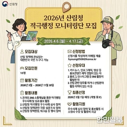한민일보 서울포커스 임경복 기자 | 산림청은 국민이 체감할 수 있는 적극행정을 널리 알리고, 국민과의 소통을 강화하기 위해 6일부터 17일까지 ‘2026년 산림청 적극행정 모니터링단’을 모집한다고 밝혔다.