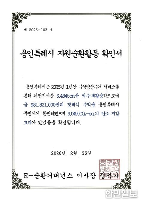 한민일보 서울포커스 김성윤 기자 | 용인특례시는 2025년 폐전자제품 무상방문수거 실적에서 경기도 내 1위를 달성했다고 7일 밝혔다.