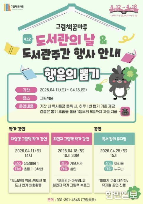 한민일보 서울포커스 임경복 기자 | 군포 그림책꿈마루는‘도서관의 날(4월 12일)’을 맞아 이용자 누구나 참여할 수 있는 다양한 문화 프로그램을 운영한다고 밝혔다.