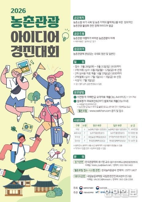 한민일보 서울포커스 임경복 기자 | 농림축산식품부와 농촌진흥청은 ‘농촌관광 여행자가 바라본 농촌관광의 미래’란 주제로'2026년 농촌관광 아이디어 경진대회'를 공동으로 개최한다고 밝혔다.