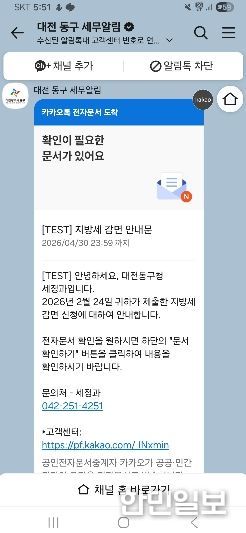 한민일보 서울포커스 임경복 기자 | 대전 동구는 이달부터 납세자 권익 보호를 위한 시책의 일환으로 ‘지방세 감면 유예기간 알림톡 서비스’를 본격 추진한다고 7일 밝혔다.