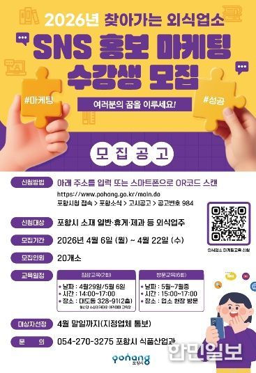 한민일보 서울포커스 임경복 기자 | 포항시는 지역 외식업소의 자생력과 온라인 홍보 역량 강화를 위해 ‘2026년 찾아가는 외식업소 SNS 마케팅 교육’ 참여 업소를 모집한다.