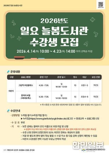 한민일보 서울포커스 김봉순 기자 | 경상북도교육청 금호도서관은 초등학생들에게 학교의 정규수업 외 추가적인 교육활동의 기회를 부여하기 위하여‘2026년 일요 늘봄도서관’프로그램을 개설하여 수강생을 모집한다.