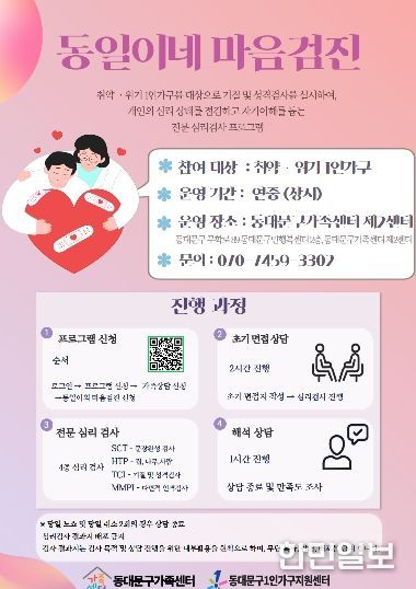 이번 사업은 '동일이의 마음상담소'와 '동일이의 마음검진' 두 가지 프로그램으로 구성되며, 1인가구의 심리 회복부터 위기 가구 조기 발굴까지 단계별 맞춤 지원을 제공하는 것이 특징이다.