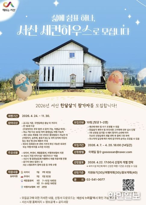 한민일보 서울포커스 임경복 기자 | 충남 서산시가 오는 4월 20일까지 ‘서산 한 달 살기’ 참가팀을 모집한다.