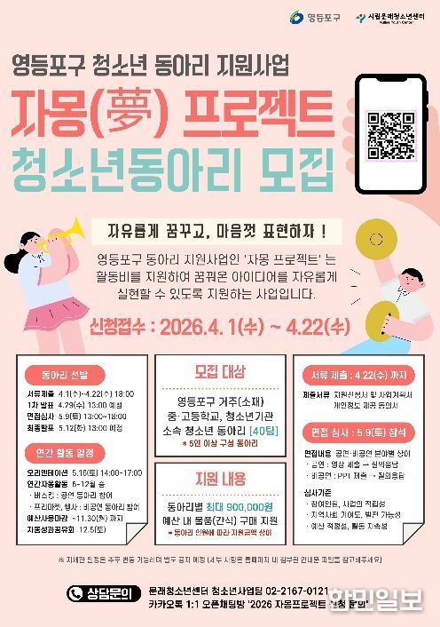 한민일보 서울포커스 임경복 기자 | 영등포구가 청소년들의 자율적 활동과 창의적인 도전을 지원하는 ‘자몽(夢) 프로젝트’에 참여할 동아리를 오는 22일까지 모집한다고 밝혔다.