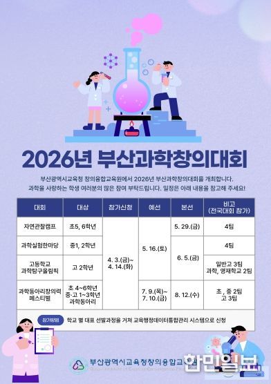 한민일보 서울포커스 임광현 기자 | 부산광역시교육청창의융합교육원은 오는 14일까지 과학 분에야 재능과 관심이 있는 부산 지역 초·중·고등학생을 대상으로 ‘2026년 부산과학창의대회’ 참가 신청을 받는다고 8일 밝혔다.