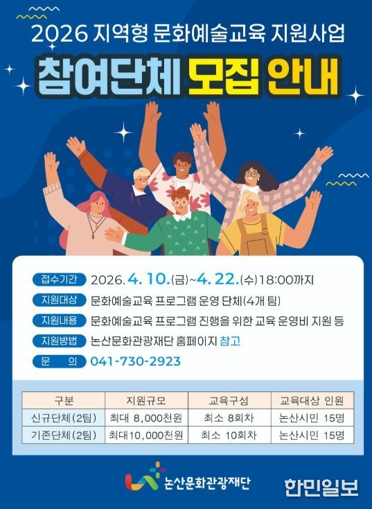 한민일보 서울포커스 유돈상 기자 | 논산문화관광재단은 지역 문화시설과 자원을 활용한 지속가능한 문화예술교육 기반 구축을 위해 ‘2026 지역형 문화예술교육 지원사업’ 운영단체를 공개 모집한다.