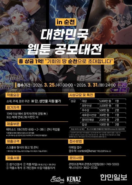 한민일보 서울포커스 임광현 기자 | 순천시와 ㈜케나즈가 공동으로 주최한 '대한민국 웹툰 공모대전 in 순천'이 전국적인 관심 속에 성황리에 접수를 마쳤다.