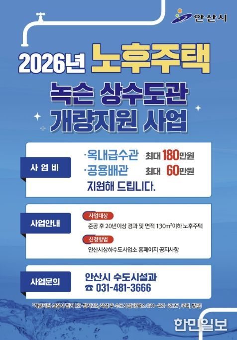 한민일보 서울포커스 임철현 기자 | 안산시는 노후주택 상수도관에서 발생할 수 있는 녹물을 예방하고 안전하고 깨끗한 수돗물을 공급하기 위해 ‘녹물 없는 우리 집 수도관 개량 지원사업’을 추진한다고 9일 밝혔다.