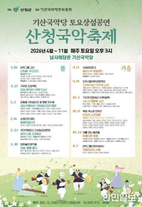 한민일보 서울포커스 김은금 기자 | 산청군은 지역 대표 관광지에서 공연을 즐길 수 있는 ‘2026년 상설 문화관광 프로그램’을 운영한다고 9일 밝혔다.