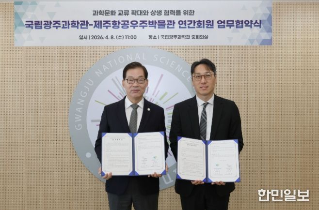 한민일보 서울포커스 기자 | 제주국제자유도시개발센터에서 운영하는 제주항공우주박물관은 4월 8일 국립광주과학관 중회의실에서 국립광주과학관과 과학문화 확산을 위한 업무협약을 체결했다고 밝혔다. 협약식에는 김석주 제주항공우주박물관장과 국립광주과학관 이정구 관장 등 관계자가 참석했다.