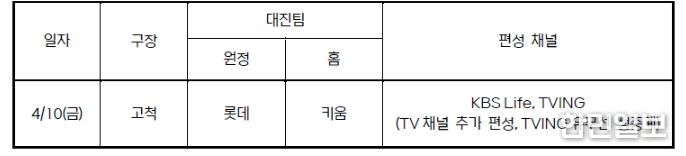 한민일보 서울포커스 최성훈 기자 | 오는 4월 10일(금) 오후 6시 30분부터 고척에서 열리는 KBO 리그 롯데-키움의 경기가 KBS Life 채널에 편성돼 생중계될 예정이다.