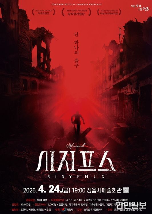 한민일보 서울포커스 김용택 기자 | 정읍시가 시민들에게 수준 높은 문화 향유 기회를 제공하기 위해, 오는 24일 오후 7시 정읍사예술회관에서 창작 음악극(뮤지컬) ‘시지프스’를 무대에 올린다.