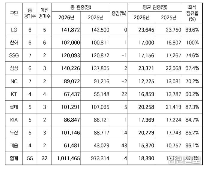한민일보 서울포커스 최성훈 기자 | 2026 신한 SOL KBO 리그가 오늘(10일) 열린 잠실, 고척, 수원, 대전, 대구 경기에 총 9만 1,459명이 입장하며 100만 관중을 달성했다.
