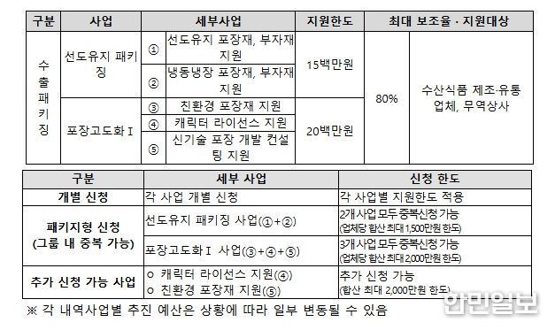 수산식품 수출업체당 최대 2,000만 원까지 ▲ 선도유지 포장재․부자재 ▲ 냉동·냉장 포장재․부자재 ▲ 친환경 포장재․부자재 ▲ 캐릭터 사용권 ▲포장재 개발 컨설팅 등 수출에 필요한 다양한 분야를 지원한다.
