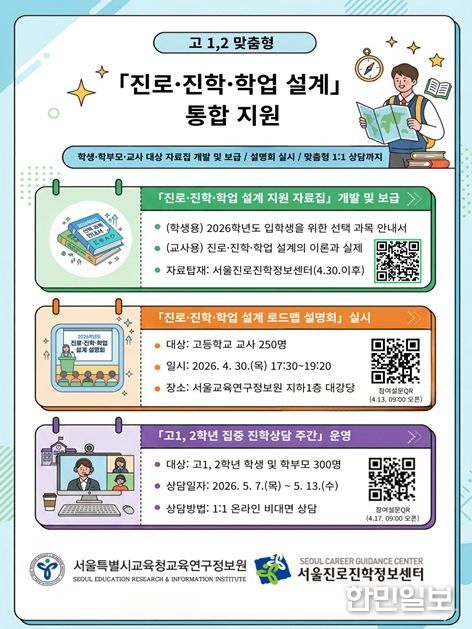 한민일보 서울포커스 국용호 기자 | 서울특별시교육청 산하 교육연구정보원(원장 양영희)은 지난 4월 2일 발표된 '서울 학생 진로·진학 지원 종합계획'의 실질적인 구현을 위해 고1·2 맞춤형 진로·진학·학업 설계 통합 지원을 본격 추진한다.