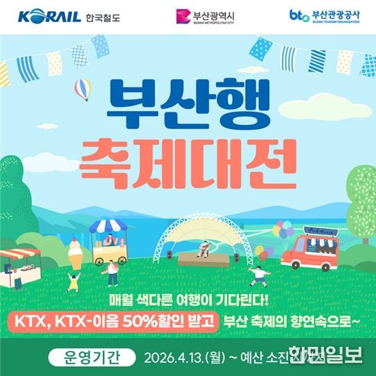 한민일보 서울포커스 임광현 기자 | 부산시는 국내 관광객 유치와 지역경제 활성화를 위해 오늘(13일)부터 철도 연계 프로모션 '2026 부산행 축제대전'을 본격적으로 운영한다고 밝혔다.