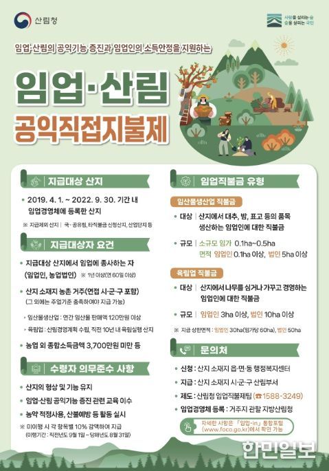 임업·산림 공익직접지불제는 산림의 공익적 가치 증진과 지속 가능한 산림경영을 유도하기 위해 일정 요건을 충족한 임업인에게 직불금을 지원하는 제도다.