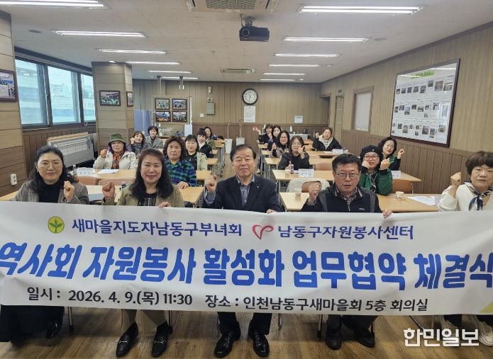 한민일보 서울포커스 김성혜 기자 | 인천시 남동구 새마을지도자남동구부녀회는 남동구자원봉사센터와 최근 인천남동구새마을회 5층 회의실에서 지역사회 자원봉사 활성화를 위한 업무협약(MOU)을 체결했다고 13일 밝혔다.