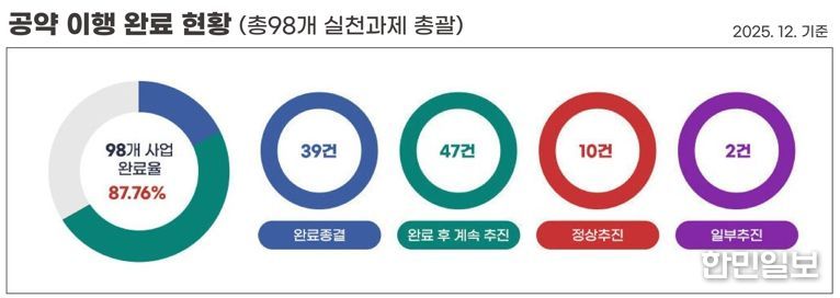 2025년 12월 말 기준 나주시는 총 98개 공약 사업 중 86개를 완료하거나 이행 후 추진해 87.76%의 이행률을 기록했으며 이는 전국 평균 70.42%보다 17.34%p, 전남 평균 68.27%보다도 크게 높은 수치다.