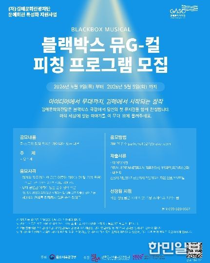 한민일보 서울포커스 김은금 기자 | (재)김해문화관광재단(대표이사 최석철) 김해문화의전당은 2026 문예회관 특성화 지원사업의 일환으로 ‘블랙박스 뮤G컬’ 피칭 프로그램을 운영하고 창작뮤지컬 초연으로 이어지는 30분 리딩 쇼케이스의 작품 공모를 진행한다.
