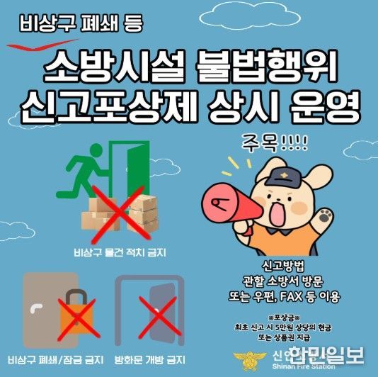 한민일보 서울포커스 임광현 기자 | 신안소방서는 화재 예방과 안전문화 확산을 위해 ‘소방시설 불법행위 신고포상제’를 연중 운영하고 있다고 밝혔다.