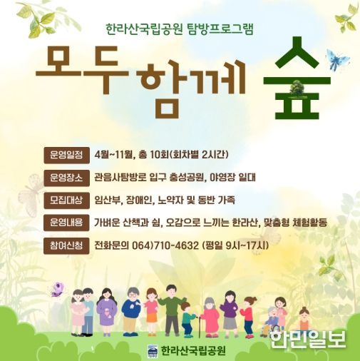 한민일보 서울포커스 임경복 기자 | 한라산국립공원이 4월부터 자연 체험과 치유를 결합한 탐방 프로그램 2종을 새롭게 선보인다. 제주특별자치도 세계유산본부는 ‘모두 함께 숲’과 ‘다같이 돌자, 야영장 한바퀴!’를 관음사 일대에서 운영한다.