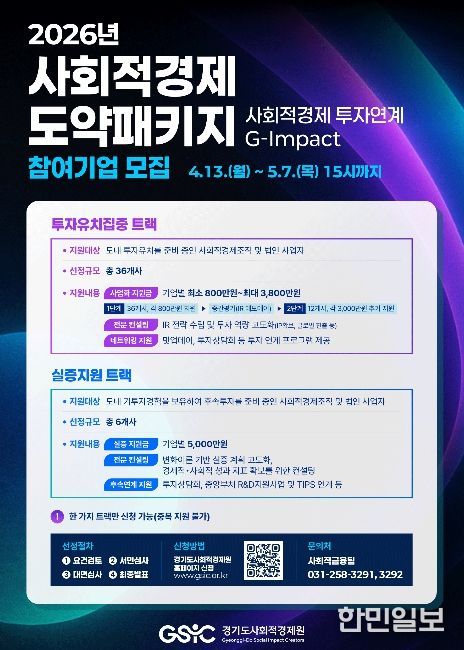 한민일보 서울포커스 김윤이 기자 | 경기도사회적경제원이 사회적경제조직의 투자유치를 지원하기 위해 ‘2026년 사회적경제 도약패키지(사회적경제 투자연계 G-Impact)’ 참여기업을 5월 7일 오후 3시까지 모집한다.