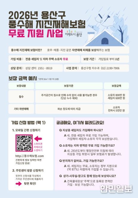 한민일보 서울포커스 김서윤 기자 | 서울 용산구가 여름철 집중호우와 태풍 등 예기치 못한 자연재난으로부터 구민의 소중한 재산을 보호하기 위해 ‘풍수해·지진재해보험’ 가입 지원에 나섰다.