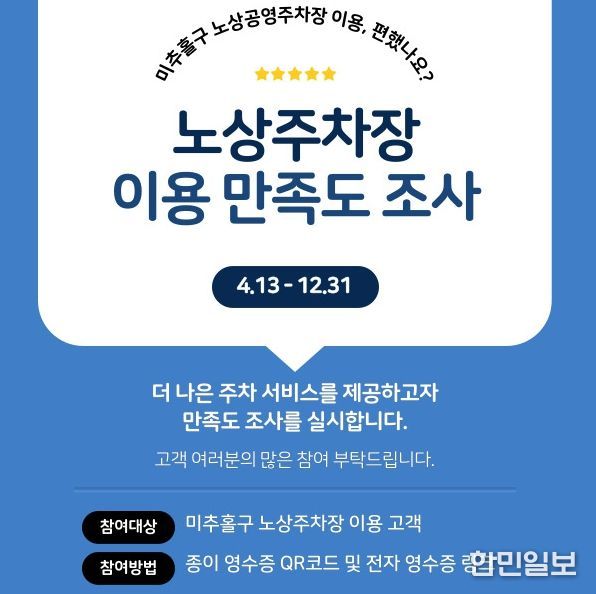 한민일보 서울포커스 백진욱 기자 | 인천 미추홀구시설관리공단은 노상공영주차장 이용 고객의 다양한 의견을 수렴하고 서비스 품질을 향상하기 위해 ‘고객 만족도 조사’를 실시한다고 밝혔다.