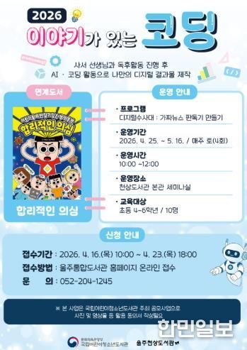 한민일보 서울포커스 기자 | 울주천상도서관이 오는 25일부터 초등학생을 대상으로 책과 코딩활동을 연계한 융합프로그램 ‘이야기가 있는 코딩’을 운영한다고 15일 밝혔다.