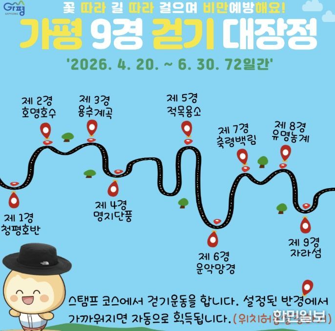 한민일보 서울포커스 최성훈 기자 | 가평군의 수려한 자연경관을 배경으로 건강을 다지는 ‘2026 가평 9경 걷기 대장정’이 오는 20일부터 시작된다. 가평군보건소는 군민들의 비만을 예방하고 걷기 실천율을 높이기 위해 이번 프로그램을 마련했다고 15일 밝혔다.