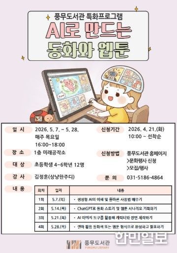 한민일보 서울포커스 임경복 기자 | 김포시 풍무도서관은 가정의 달을 맞아 초등학생 4~6학년을 대상으로 ‘인공지능(AI)으로 만드는 동화와 웹툰’을 오는 5월 7일부터 28일까지 매주 목요일 오후 4시부터 6시까지 총 4회에 걸쳐 운영한다.