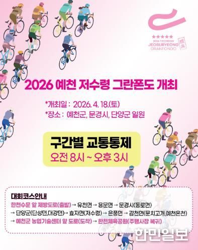 한민일보 서울포커스 최성훈 기자 | 예천군은 오는 18일 오전 8시부터 오후 3시까지 예천군과 문경시, 단양군 일원에서 '2026 예천 저수령 그란폰도' 대회를 개최한다고 밝혔다.