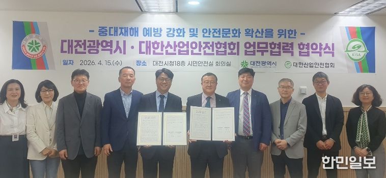 한민일보 서울포커스 김서윤 기자 | 대전시는 4월 15일 시청 시민안전실 회의실에서 대한산업안전협회 대전지역본부와‘중대재해 예방 강화를 위한 업무협약’을 체결했다.
