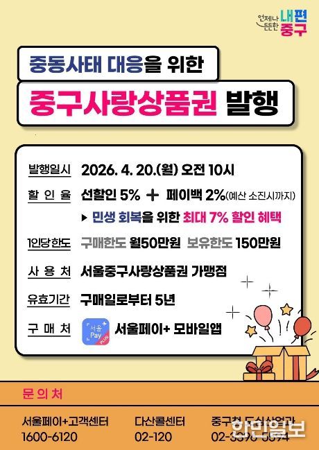 한민일보 서울포커스 김서윤 기자 | 서울 중구가 중동전쟁으로 인한 경기 불안과 소비 위축에 대응하기 위해 20억 원 규모의 '서울중구사랑상품권'을 오는 20일 발행한다.