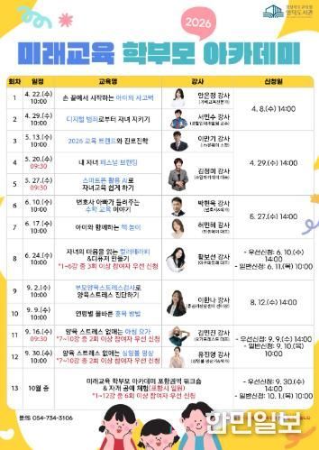 한민일보 서울포커스 임경복 기자 | 경상북도교육청 영덕도서관은 학부모 및 예비 학부모, 일반인을 대상으로 '2026년 미래교육 학부모 아카데미' 강좌를 이달 22일부터 운영한다고 밝혔다.
