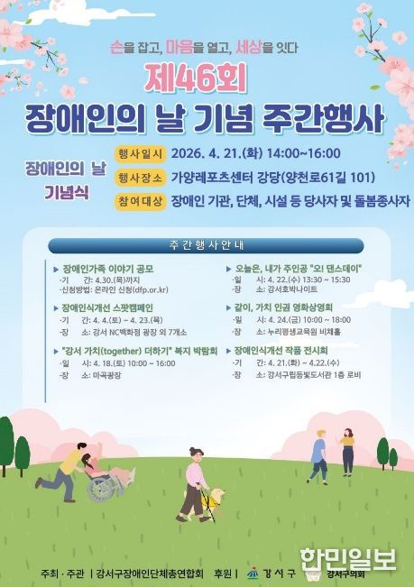 한민일보 서울포커스 전희주 기자 | 서울 강서구는 4월 20일 장애인의 날을 맞아, 오는 18일부터 일주일간 ‘제46회 장애인의 날 기념 주간행사’를 개최한다고 밝혔다.