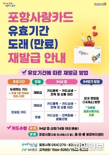 재발급 안내는 포항사랑상품권 운영대행사인 iM뱅크를 통해 유효기간 만료 60일 전 문자로 발송되며, 읍면동 행정복지센터와 판매대행 금융기관, 시 홈페이지 등을 통해서도 확인할 수 있다.