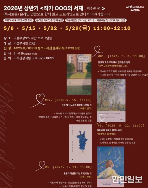 한민일보 서울포커스 심기옥 기자 | 의정부시는 2026년 상반기 ‘작가 OOO의 서재: 백수린 편’을 5월 매주 금요일(8일, 15일, 22일, 29일) 총 4회에 걸쳐 의정부정보도서관에서 운영한다.