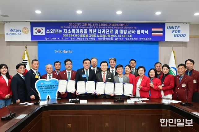 한민일보 서울포커스 임경복 기자 | 고령군과 국제로타리 3700지구 고령로타리클럽(회장 최유승)은 4월 15일, 고령군청에서 관내 저소득 취약계층의 구강 건강 증진을 위한 ‘치과진료 및 예방교육 사업’업무 협약을 체결했다.