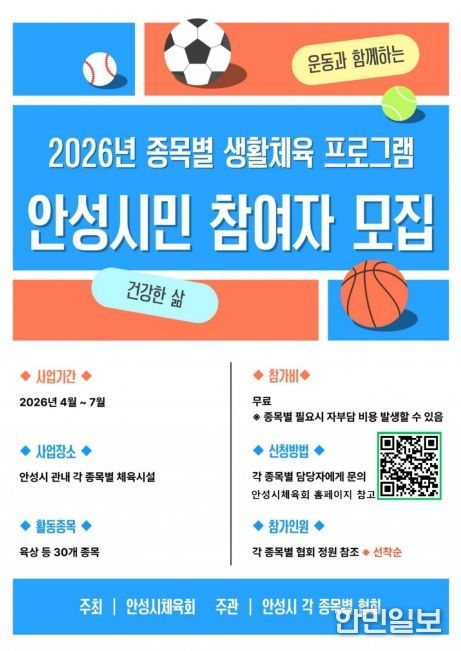 한민일보 서울포커스 임경복 기자 | 안성시는 시민 누구나 일상에서 부담 없이 운동을 즐길 수 있도록 ‘2026 종목별 생활체육 프로그램’을 운영하고, 4월부터 참가자를 모집 중이라고 밝혔다.