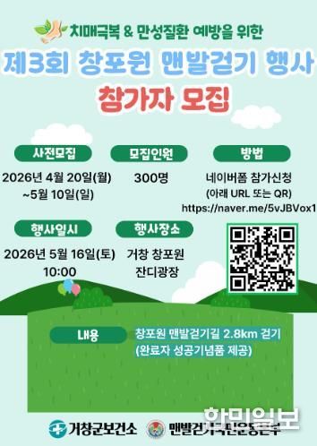 한민일보 서울포커스 김서윤 기자 | 거창군은 군민의 건강증진과 걷기 실천 문화 확산을 위해 ‘제3회 창포원 맨발걷기 행사’ 참가자를 오는 20일부터 5월 10일까지 사전 모집한다.