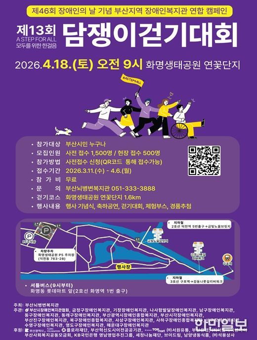 한민일보 서울포커스 임광현 기자 | 부산시는 장애인의 날(4.20.)을 맞이해 내일(18일) 오전 9시 화명생태공원에서 '제13회 담쟁이 걷기대회'가 열린다고 밝혔다.