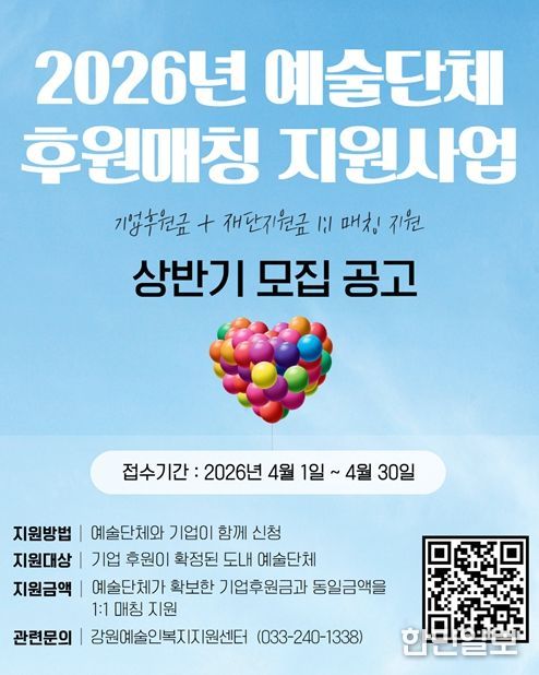한민일보 서울포커스 곽중희 기자 | 강원문화재단은 도내 예술단체의 안정적인 창작기반 마련과 기업의 문화예술 후원 참여 확대를 위해 '2026년 예술단체 후원매칭 지원사업' 상반기 공모를 추진한다.