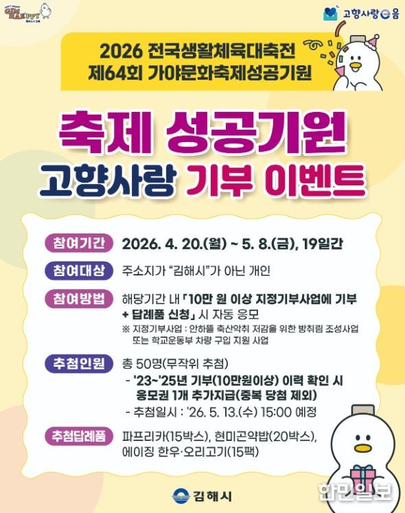 김해시 관계자는 “이번 이벤트는 대규모 체육·문화 행사의 성공을 기원하고 지역의 시급한 현안을 해결하는 지정기부 사업을 널리 알리기 위해 기획됐다”며, “고향을 사랑하는 마음이 담긴 기부가 지역 발전의 큰 힘이 되는 만큼 많은 분의 적극적인 관심과 참여를 부탁드린다”고 전했다.