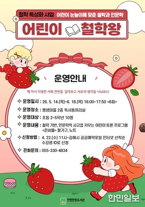 한민일보 서울포커스 김은금 기자 | 김해시 진영한빛도서관은 오는 5월부터 어린이의 사고력과 표현력 증진을 위한 철학 특성화 프로그램 ‘어린이 철학왕’을 운영한다고 17일 밝혔다.